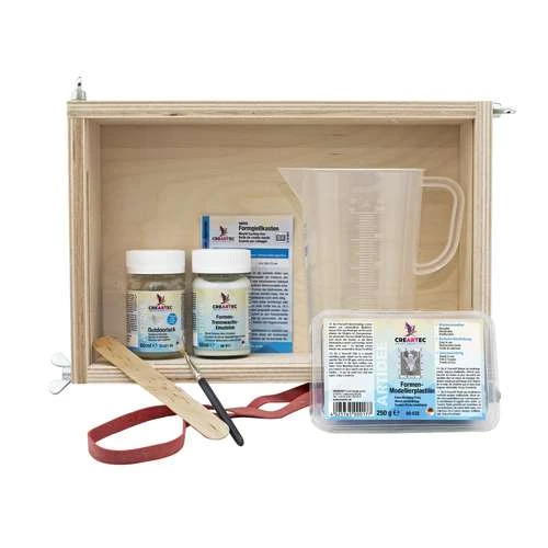 This Artidee Varioform casting vessel is provided with a rubber form band, 50ml bottles of universal, colourless decorative varnish and form separating wax, form modelling paste, a stirrer, a mixing bowl, a priming brush and instructions.