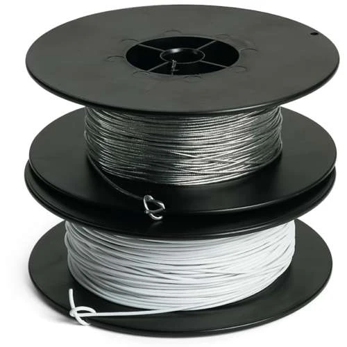 Asre Steel Cord is sold on 100 metre spools. It is available in either galvanized or white plastic coated.