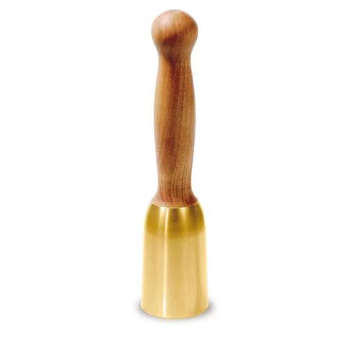 Brass mallet, 19cm long, 47mm wide, weighing 450g, and set on a cherry wood handle.
