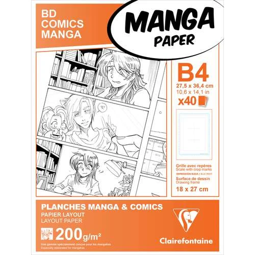 There are 2 types of Clairefontaine BD Comics Manga Storyboard Pad available. One is 200gsm, 40 sheets, and has no pre-printed scale. It is suitable for marker pens and is bleedproof and resistant to inking. The second type is 55gsm, 100 sheets, and each sheet has a pale blue pre-printed scale to help draw strips and comic squares. This scale disappears when the paper is scanned. These pre-printed Clairefontaine BD Comics Manga Storyboard Pads have either a simple frame or a 6-square frame.