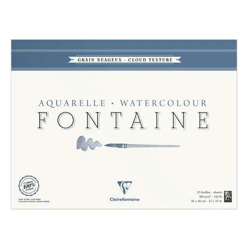 Clairefontaine Fontaine Cloud Texture Watercolour Paper is 100% cotton, 300gsm, pH neutral and free from optical brighteners. It is manufactured on a cylinder machine but the purity of the water and cotton used to make the pulp, combined with the quality and consistency of the glue coating (both in the pulp and on the surface) make this paper unique in its handmade-like finish. Using Clairefontaine Fontaine paper is a joy because it has a great capacity for absorption and resistance to wrinkling, whilst offering excellent colour reproduction and preserving the transparency of the colours The quality of the finish means retouching is also possible.
