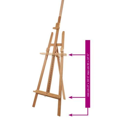 This Mabef M13 basic easel has a minimum height of 1.15m and maximum 2.25m. It weighs 5kg, is 45cm wide, and supports canvases up to 1.20m.