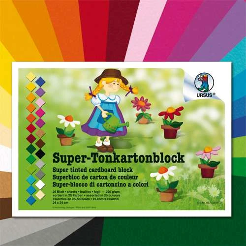 Super coloured cardboard block, containing 25 24cmx34cm sheets of 220gsm card, in different colours.
